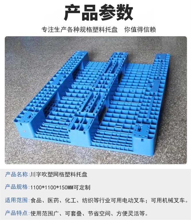 川字吹塑網(wǎng)格塑料托盤為'川字型吹塑托盤的一種,此塑料托盤的表面為網(wǎng)格狀,托盤的底部形狀為'川'字狀,顧稱為川字吹塑網(wǎng)格盤,在使用上有煙草塑料托盤、化工塑料托盤、食品塑料托盤等很多類型,川字吹塑網(wǎng)格盤適用范圍:化工、石化、食品、水產(chǎn)品、飼料、制衣、制鞋、電子、電器、港口、碼頭、餐飲、生物醫(yī)藥、機(jī)械五金、石油化工、立體倉儲(chǔ)、物流運(yùn)輸、儲(chǔ)存貨架,汽菊配件、啤酒飲料、紡織印刷、印刷包裝、秘充中,俘等各有于業(yè)。