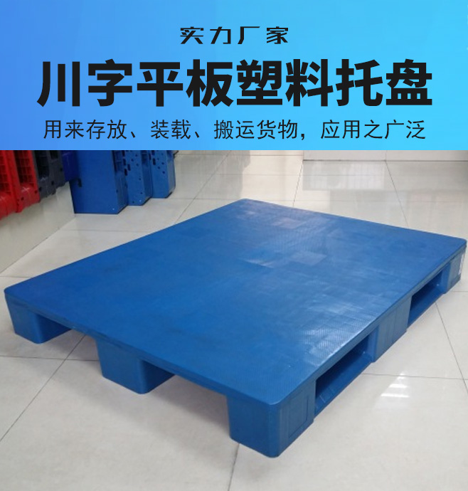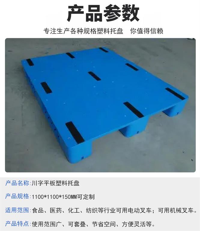 川字平板塑料托盤四面進叉,適合平地、堆垛、貨架、叉車周轉貨物使用。