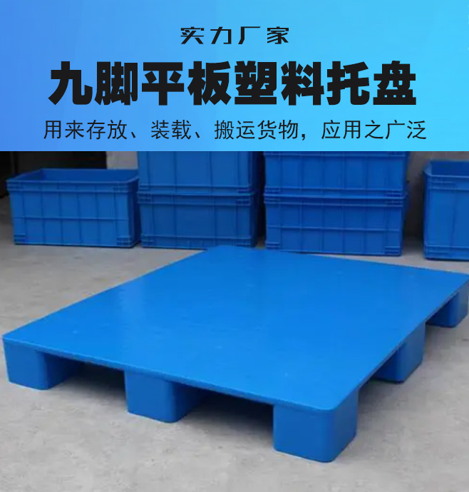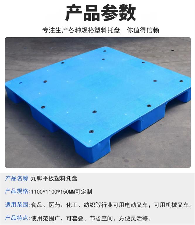 九腳型平板塑料托盤此款托盤底部有‘九個腳,表面是平板的塑料,九腳型平板塑料托盤在紡織廠、食品廠、醫藥廠等企業應用較為廣泛,九腳平板塑料托盤與鋼托盤,木托盤相比具有質輕、平穩,美觀整體性好,無釘無刺。耐酸堿,不腐爛,不易被細菌繁殖,易清洗消毒,不助燃,無靜電,無火花,防暴,防滑溜,回收價值高等特點,九腳平板塑料托盤,設計美觀,可以提升企業形象,提高企業物流效率。
