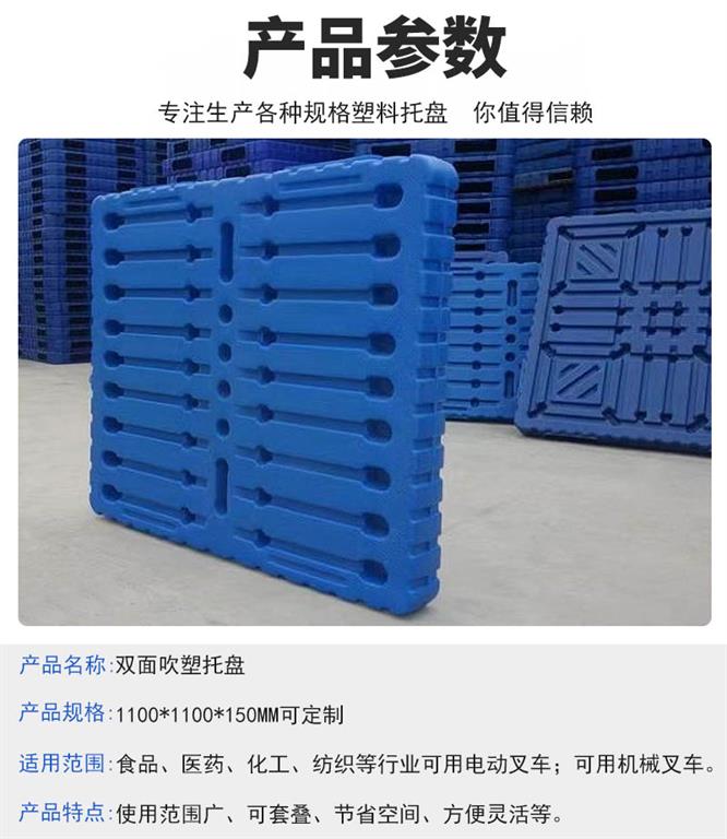3.雙面吹塑塑料托盤產品選用高分子量高密度聚乙烯樹脂,經擠出一次吹塑成型。成型過程快速、充分;產品成型飽滿,內在質量和性能穩定。